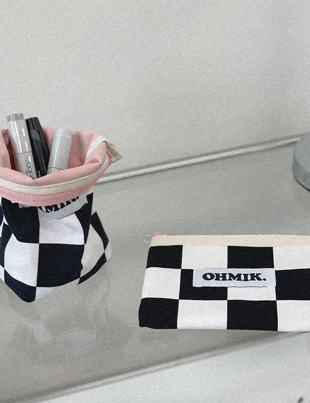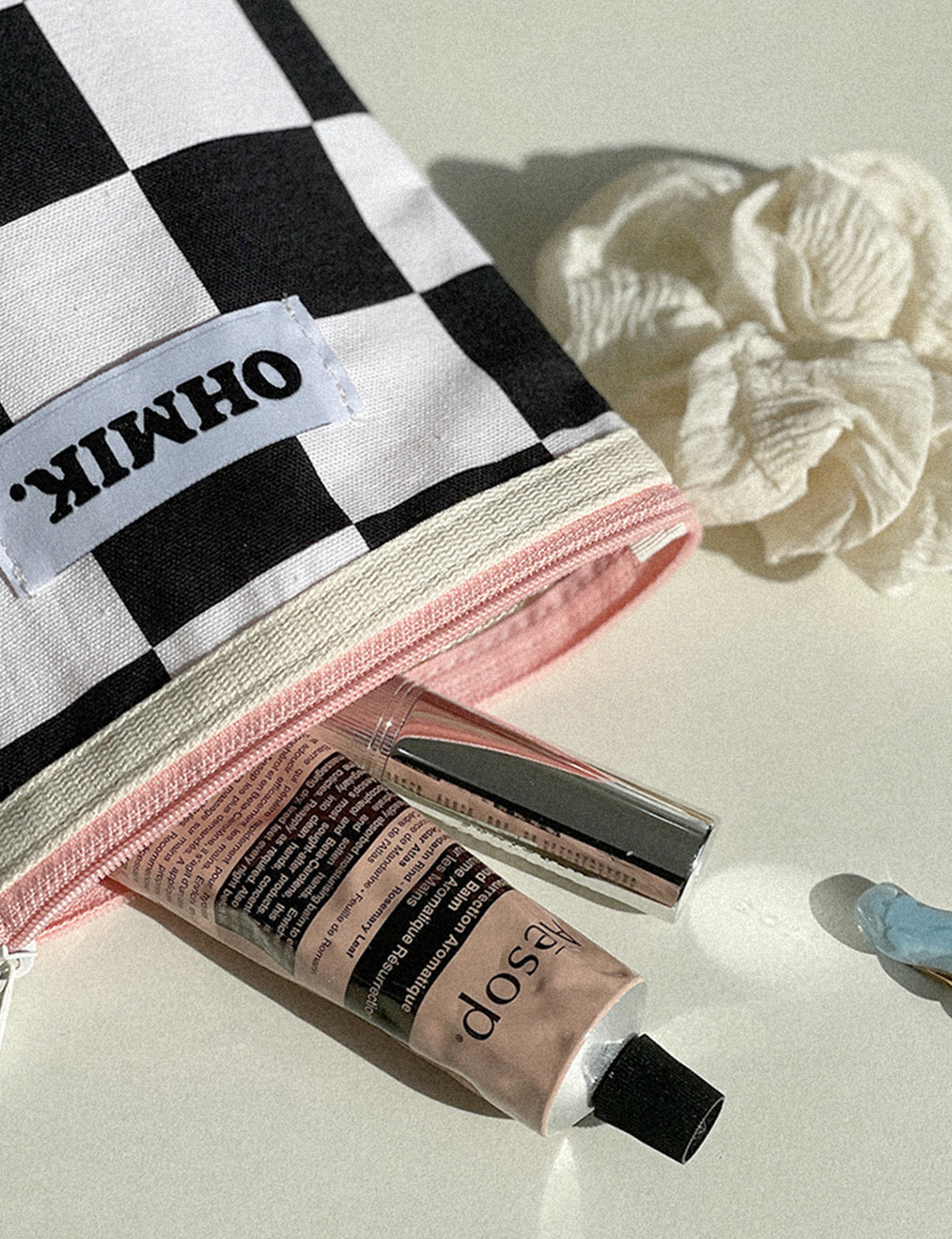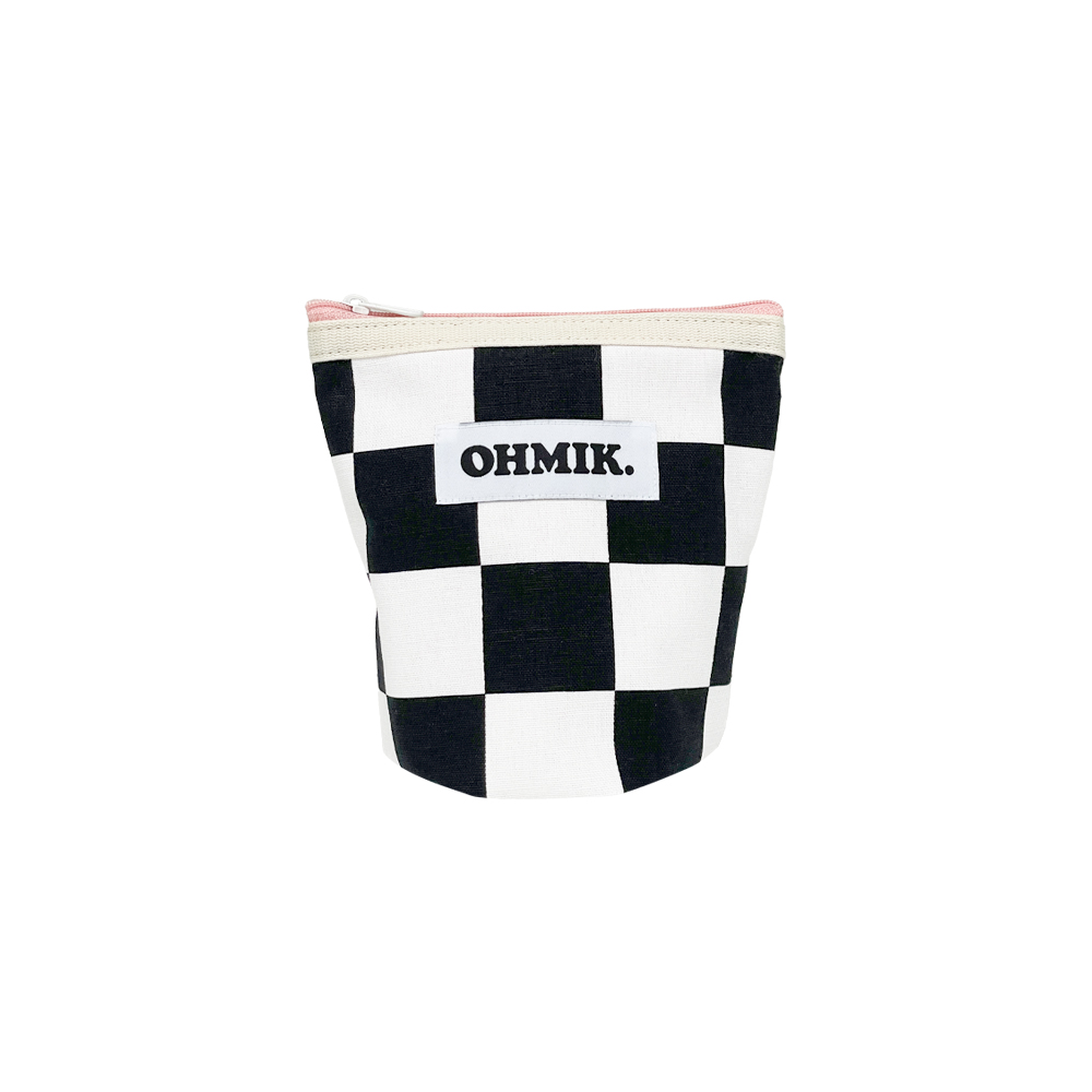 내부에 여유 폭을 두어 사용에 따라 공간이 확장 가능한 오미크 시그니처 파우치입니다.
